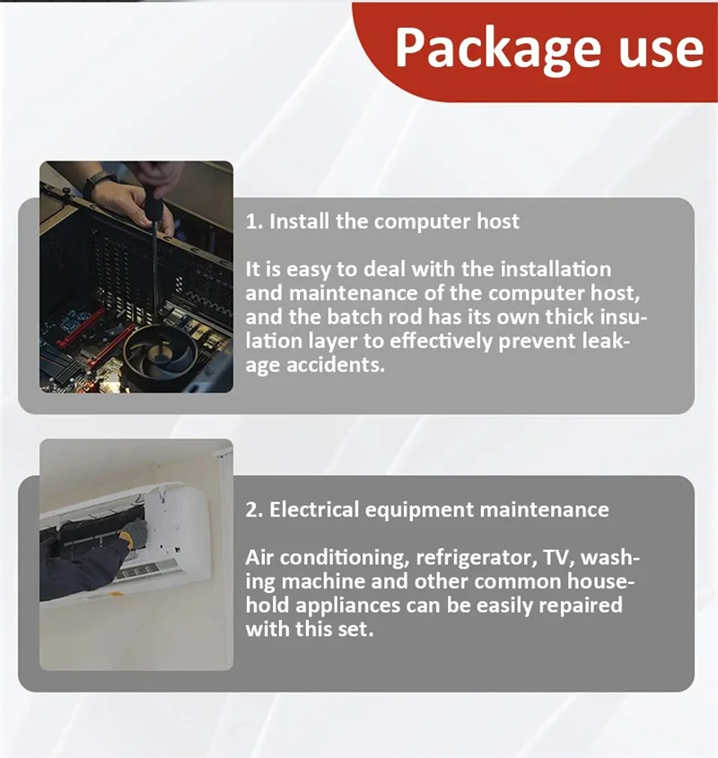 5、This electrical screwdriver set is electrician professional grade, this electrical screwdriver set is a complete tool kit to meet your various needs, replace different models according to different occasions, suitable for home DIY, automotive and home appliance repair.